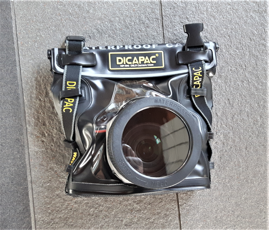 Nach einigen Recherchen bin ich auf das DiCaPac WP-S10 – www.dicapac.com – für die Nikon D810 gestoßen. Das Konzept, Bewertungen und auch Bild- und Filmbeispiele haben mich überzeugt, mir das Ding mal anzuschaffen. Mit ersten Tests ohne Kamera, wie es in der Bedienungsanleitung steht (die ich üblicherweise nie lese), habe ich mich vergewissert, dass das System funktioniert und dicht ist.