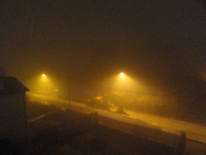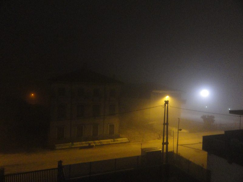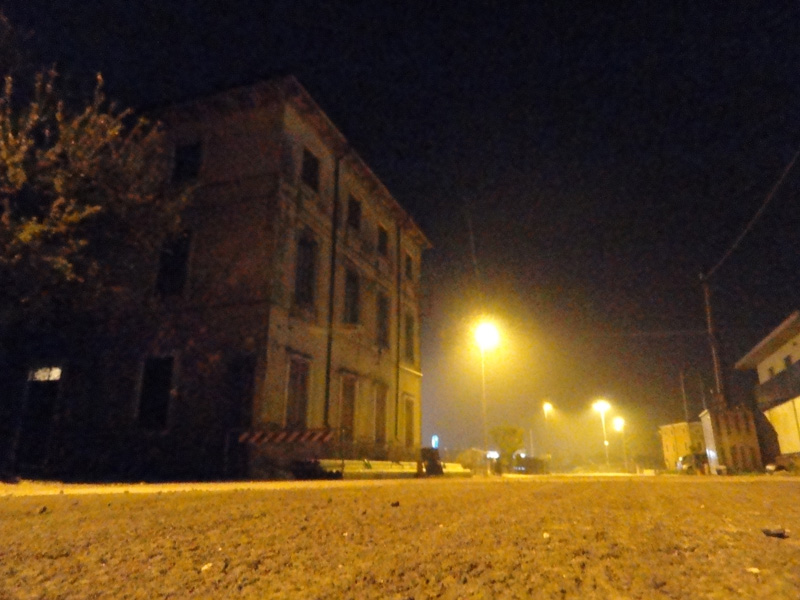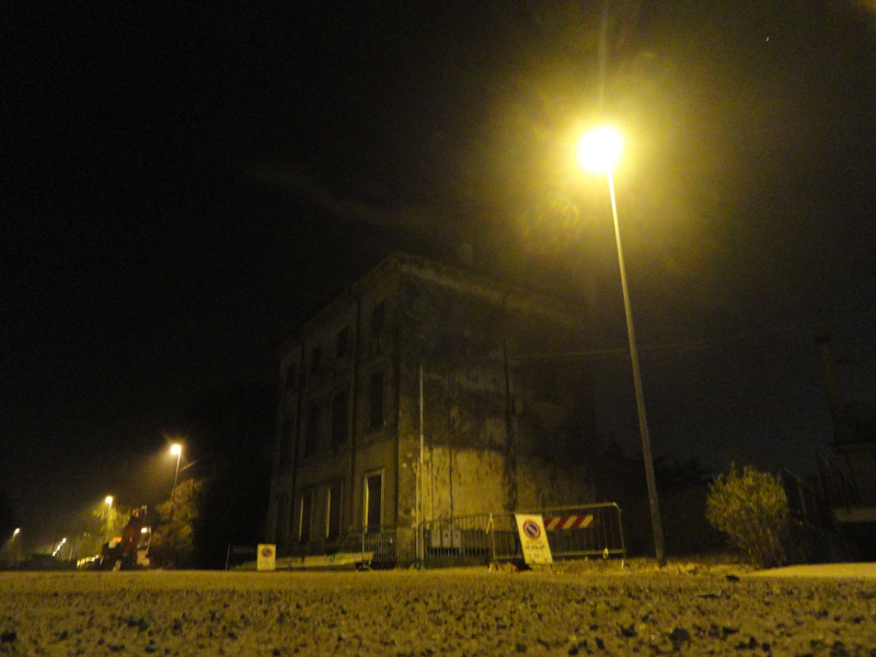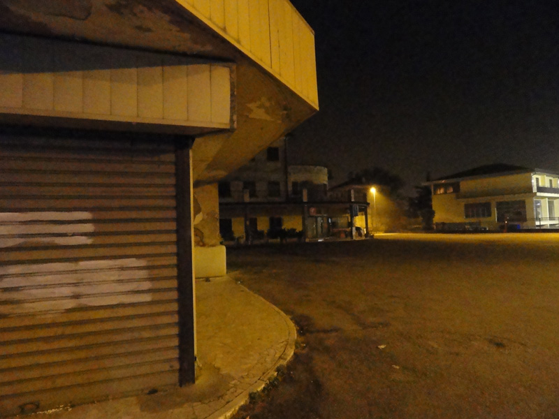 Umgebung, die wie ein Filmset wirkte. Verlassen wirkende Gebäude, harte Beleuchtung, leichter Nebel…